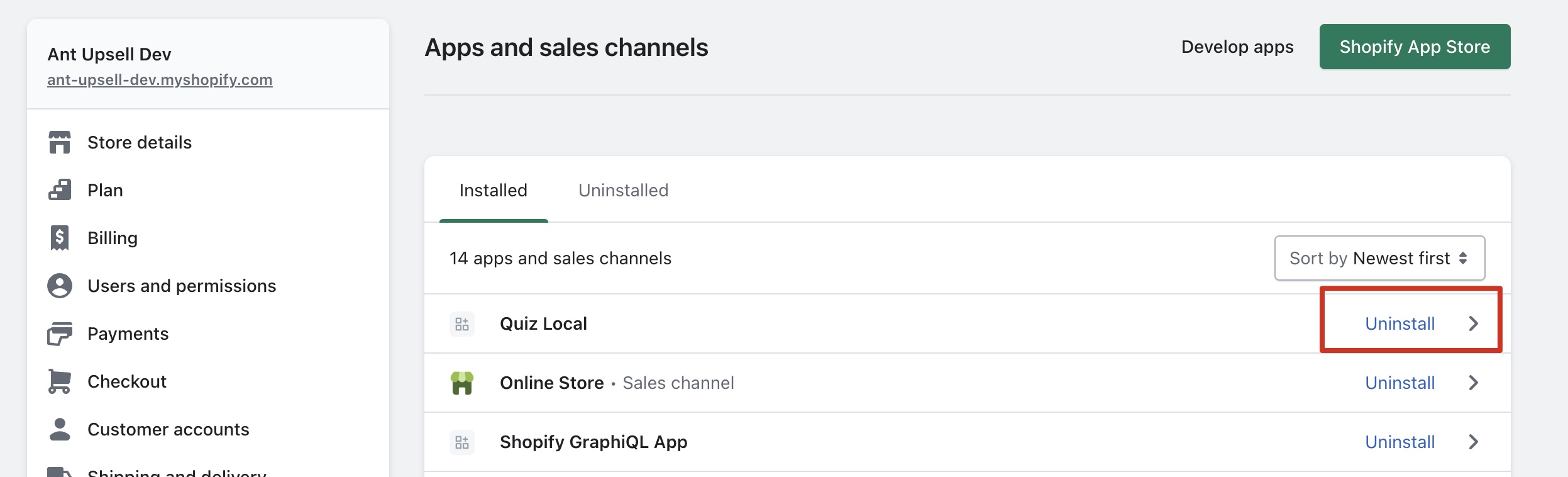 In order to delete the Quiz Kit app, find it on the Apps page, and click "Remove":